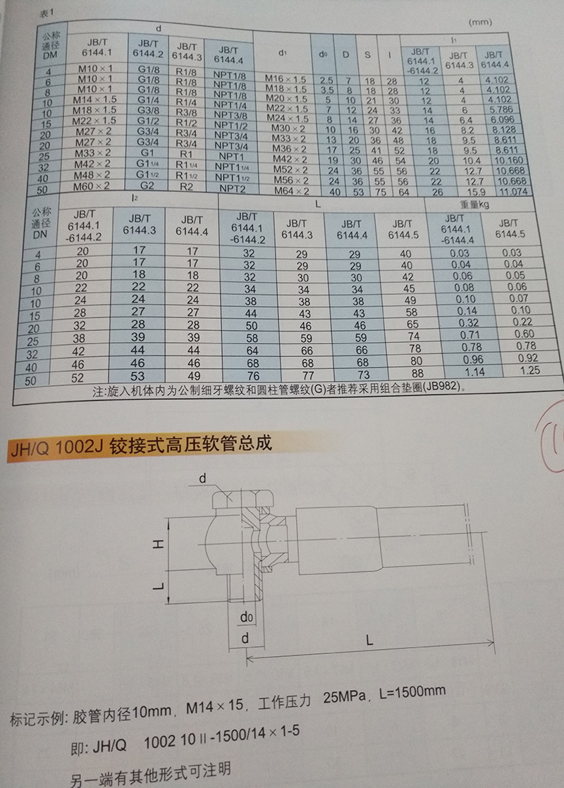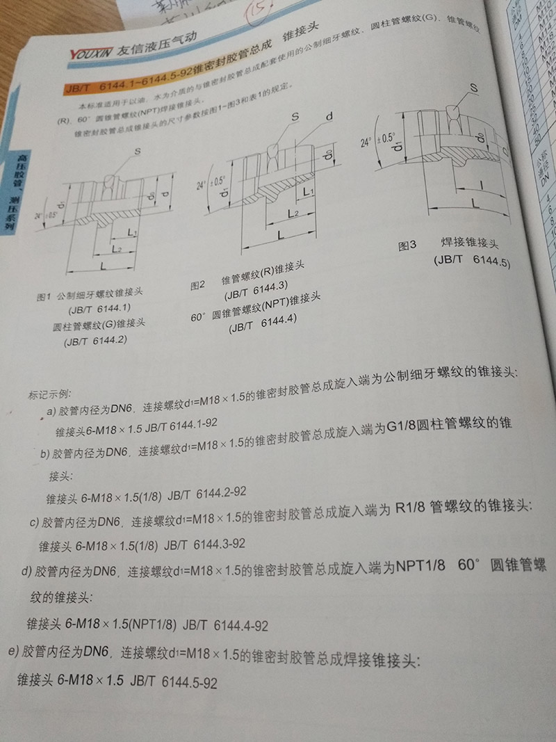 a)膠管內(nèi)徑為DN6,連接螺紋d1=M18*1.5的錐密封膠管總成旋入端為公制細(xì)牙螺紋的錐接頭:錐接頭6-M18*1.5 JB/T  6144.1-92